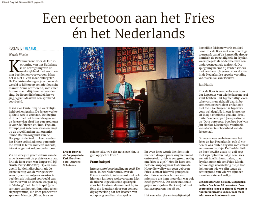 6 maart 2026 – Friesch Dagblad20 april 2024 – Dorpsklanken19 september 2023 – Leeuwarder Courant7 september 2022 – NRC Sander Janssens (fragment recensie ‘Late Night Bar’ Fringe Festival Amsterdam)1 juli 2022 – Leeuwarder Courant24 november 2021 – Drachtster Courant10 maart 2021 – Drachtster Courant12 augustus 2020 – Drachtster Courant17 juni 2020 – Friesch Dagblad