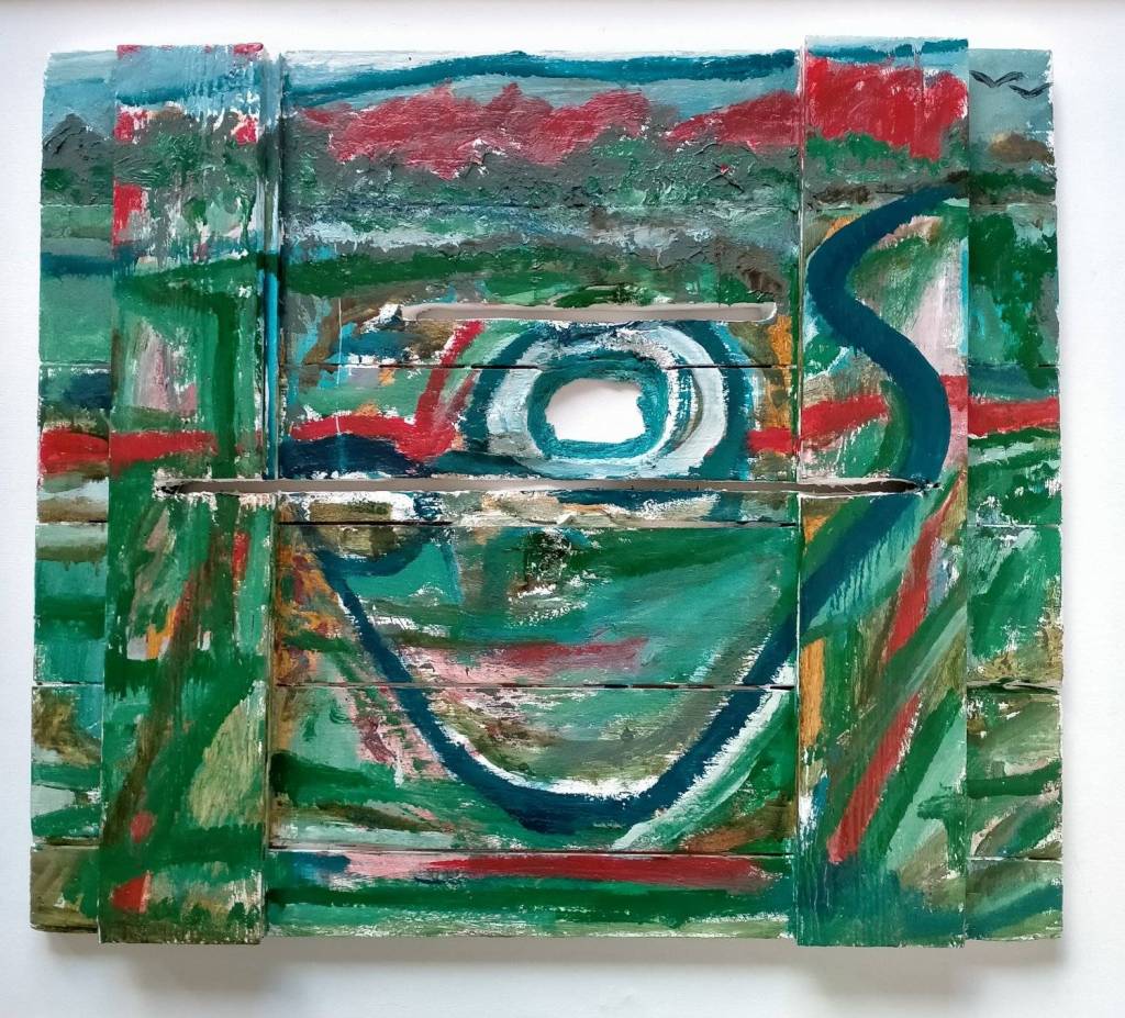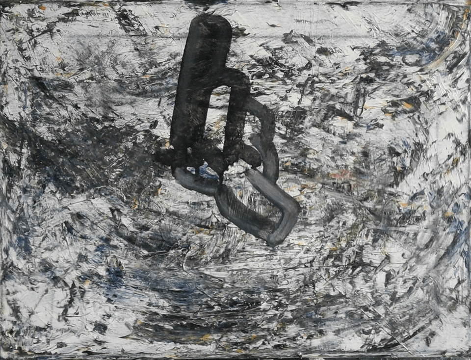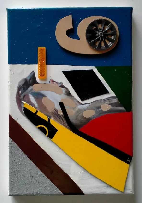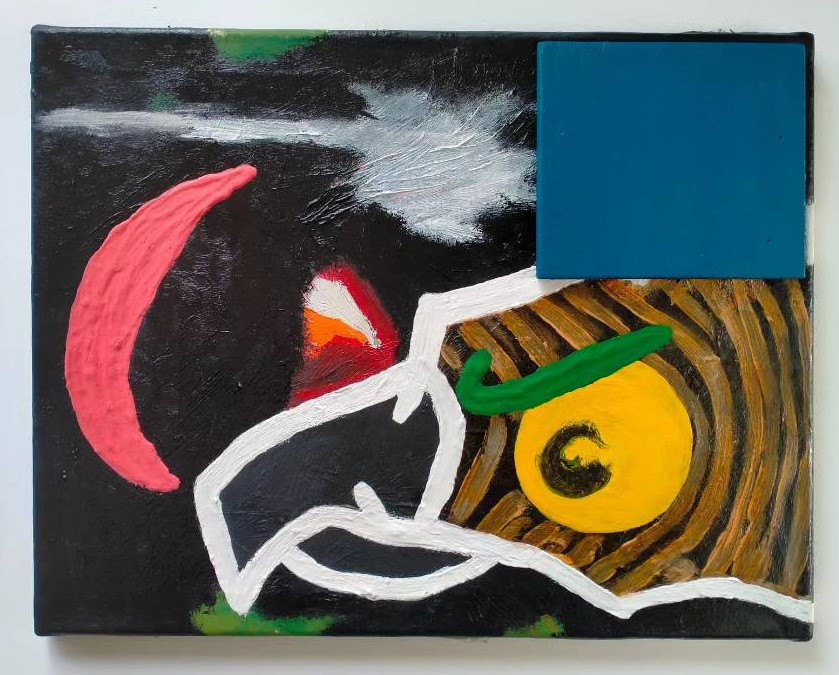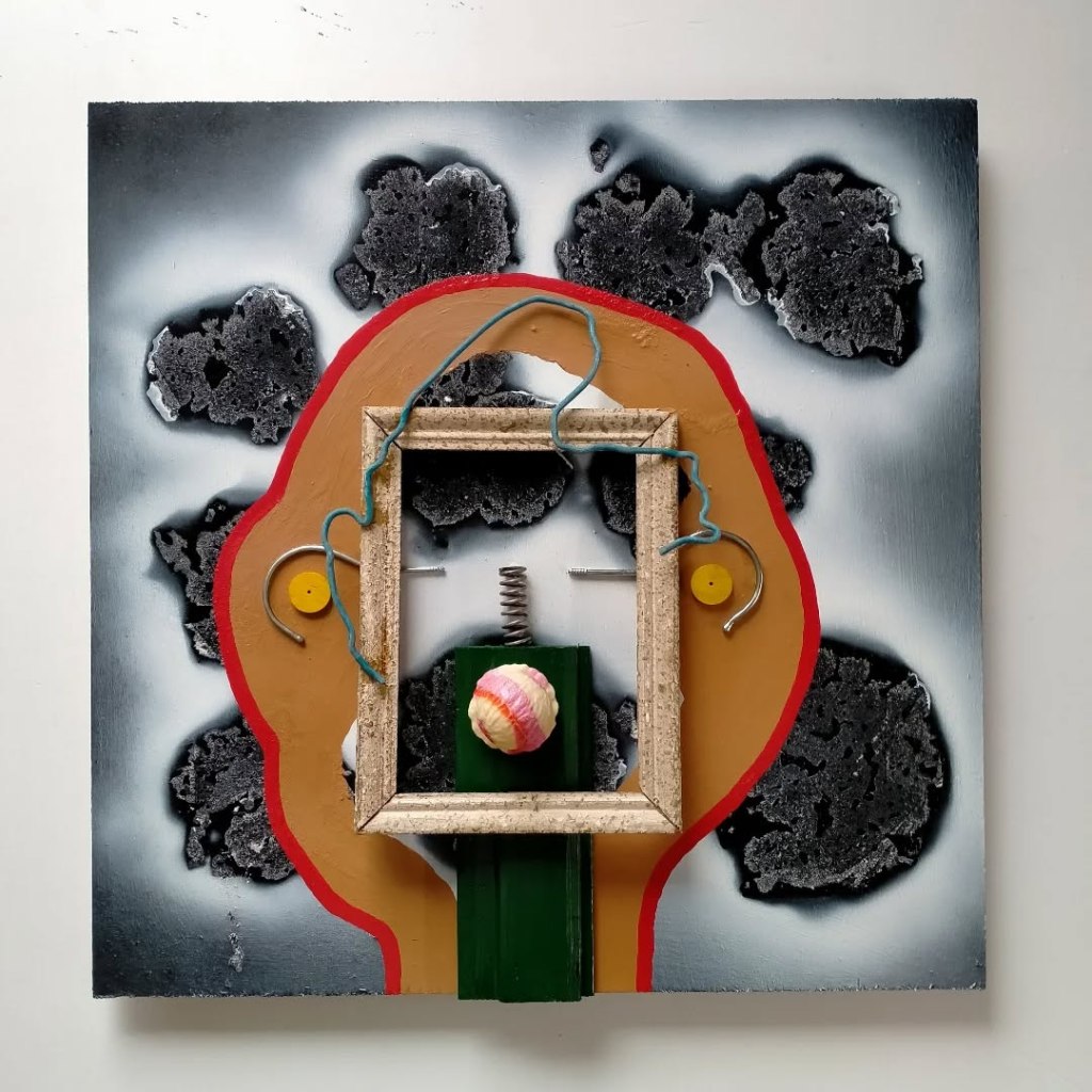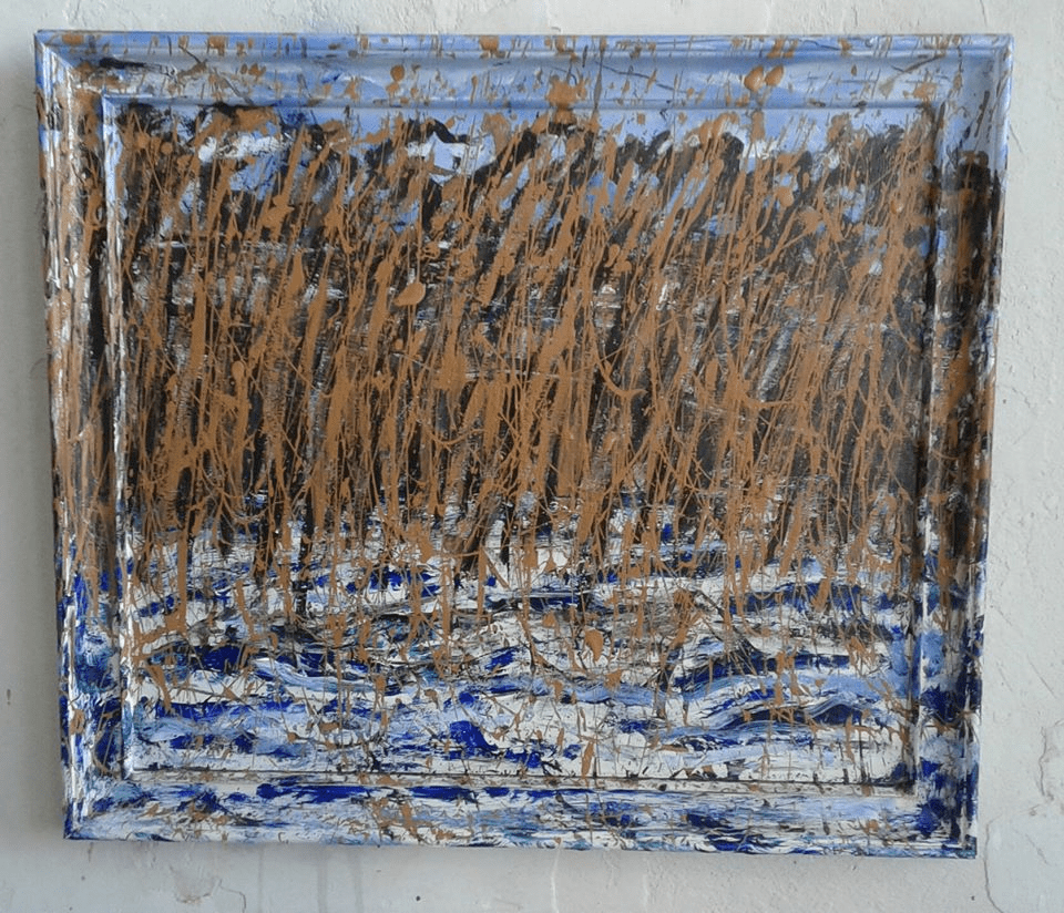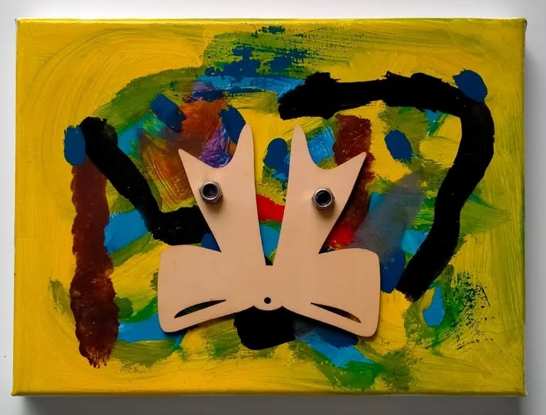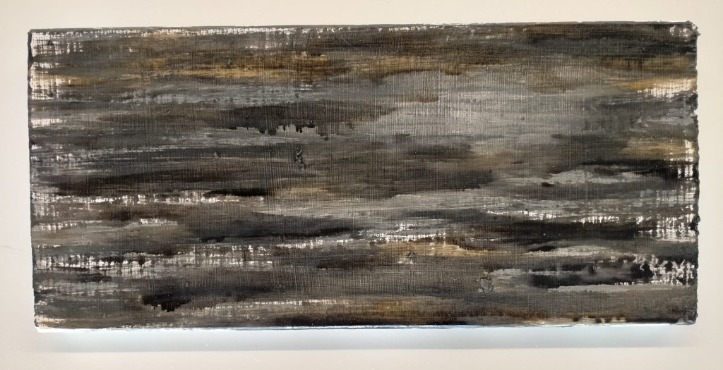 Diverse verfsoorten en metaal op paneel