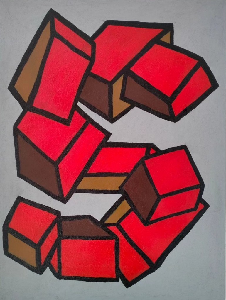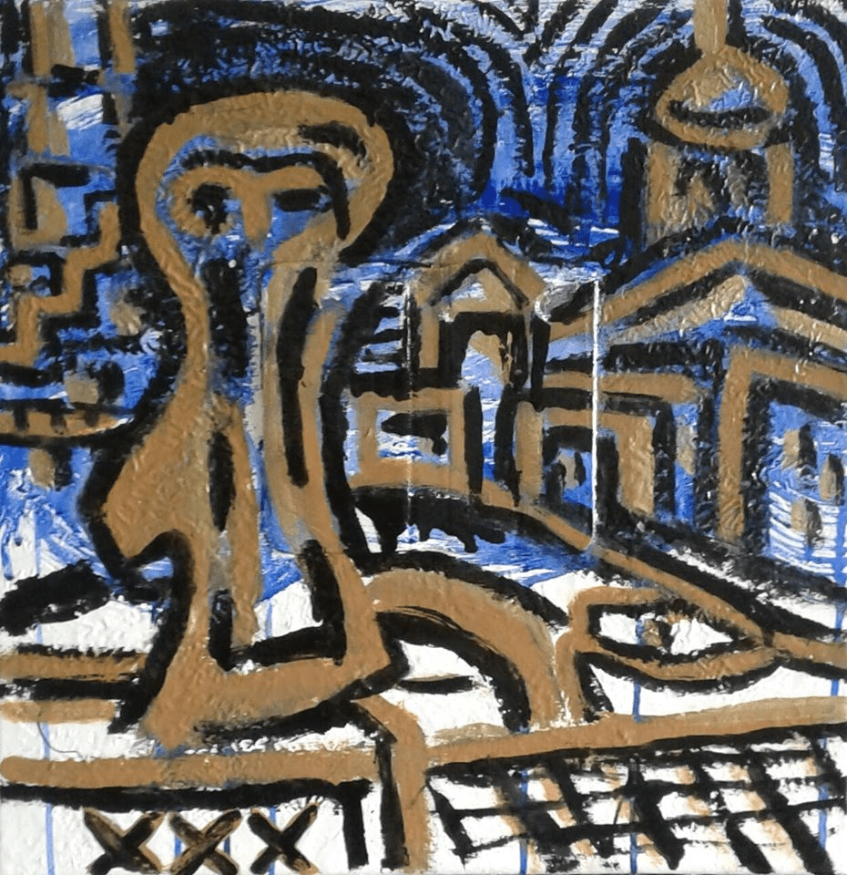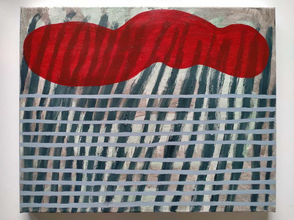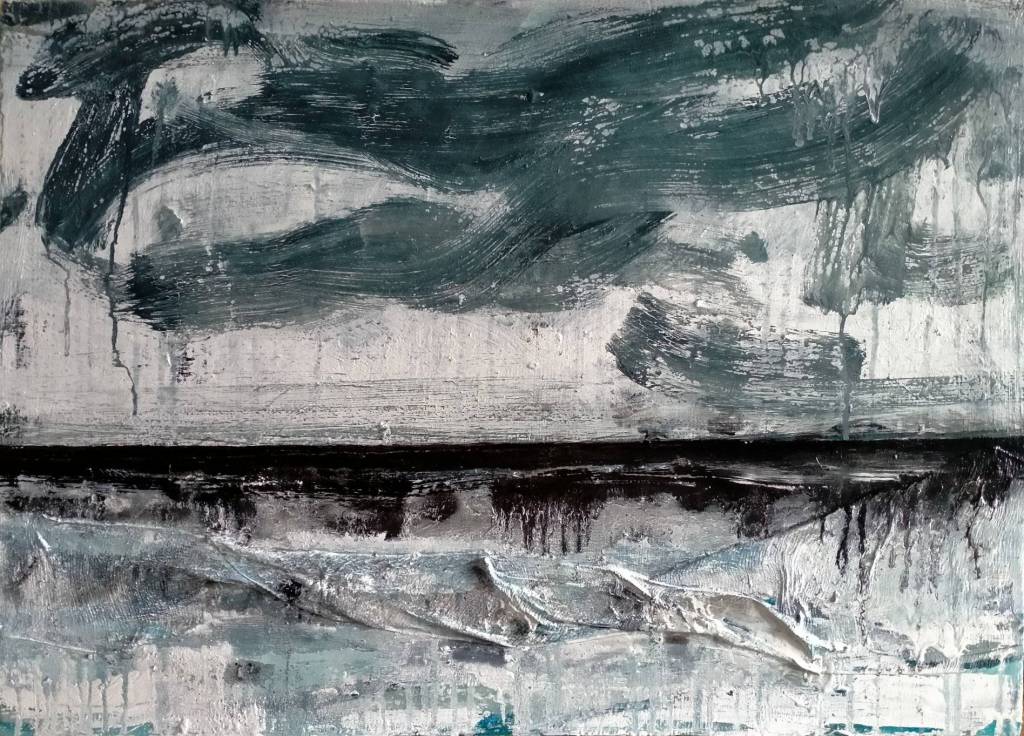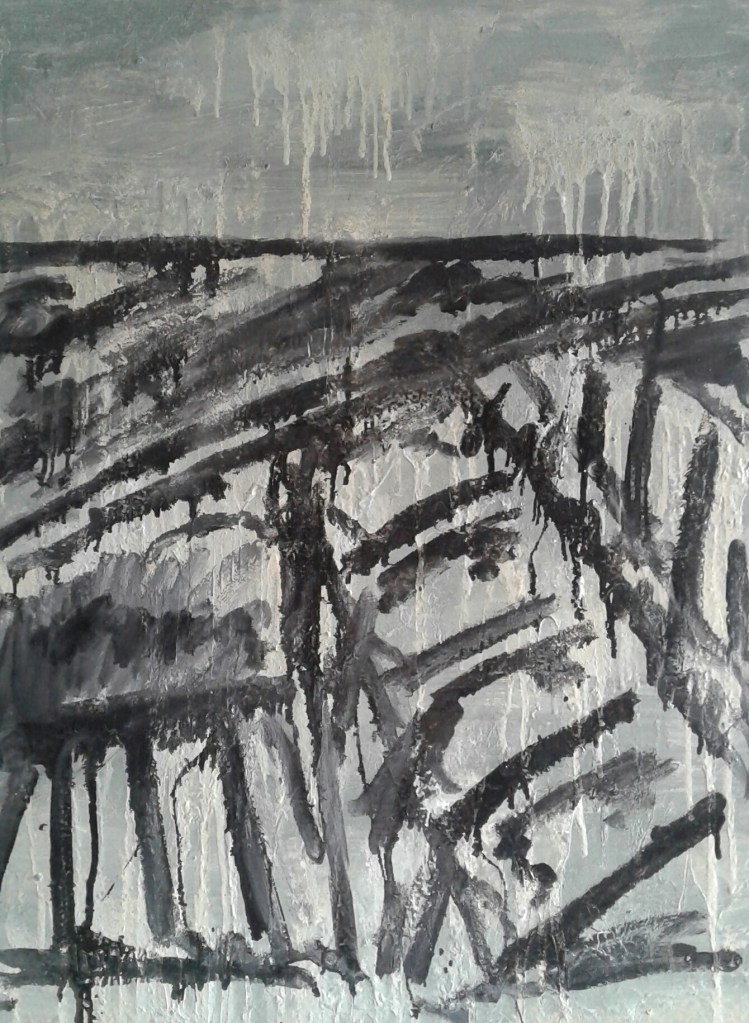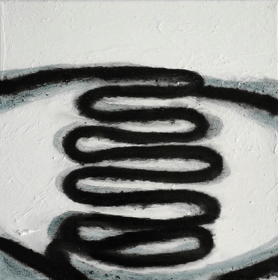 Diverse verfsoorten en metaal op paneel