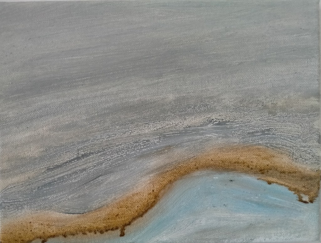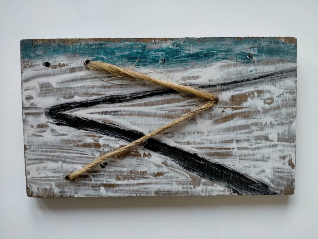 Diverse verfsoorten en jutetouw op paneel